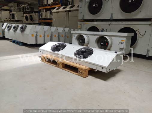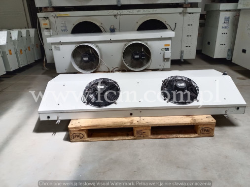 Chłodnica podsufitowa dwustronna Guntner - Typ: DHF 035B/44-L1 - Wydajność chłodnicza: 15 kW przy DT8 - Lamel: 4 mm - Ilość wentylatorów: 4 x 350 mm - Wymiary urządzenia: 2720 x 850 x 250 mm - Czynnik chłodniczy: Freon - Pojemność: 13.6 L - Stan magazynowy: 1 sztuka