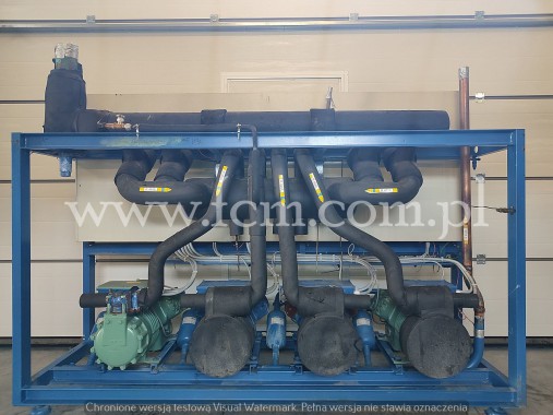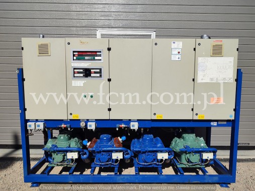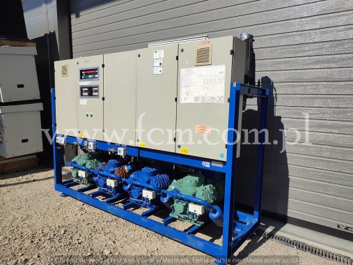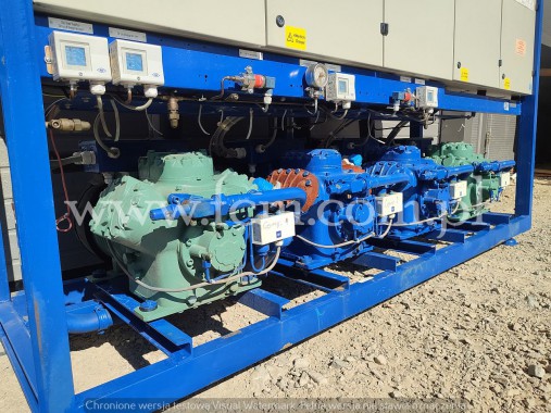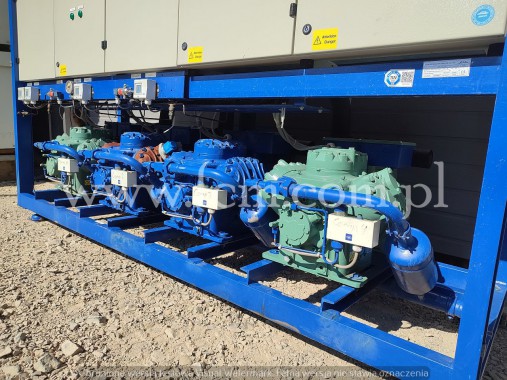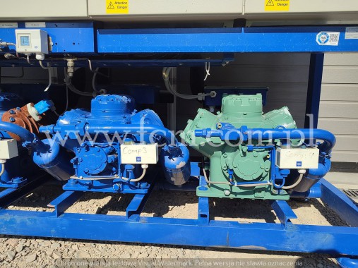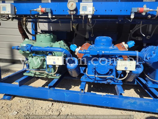Zespół sprężarek Bitzer - Typ: 2 x HSK 6461-60, 2 x HSK 7451-70 - Przepływ: 2 x 165 m3/h, 2 x 192 m3/h - Wydajność chłodnicza: 620 kW przy 0°C/40°C, 520 kW przy -5°C/40°C, 420 kW przy -10°C/40°C - Czynnik chłodniczy: R404A - Wymiary urządzenia: 4300 x 1200 x 1500 mm - Stan magazynowy: 1 sztuka