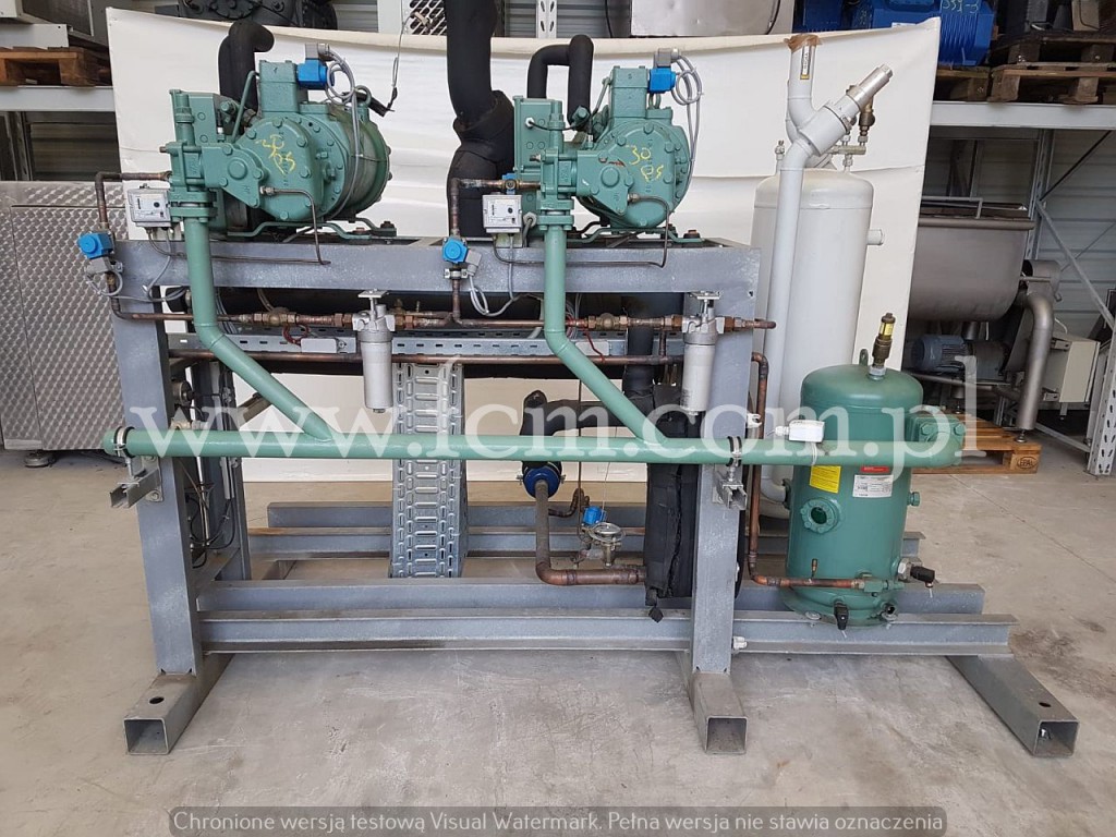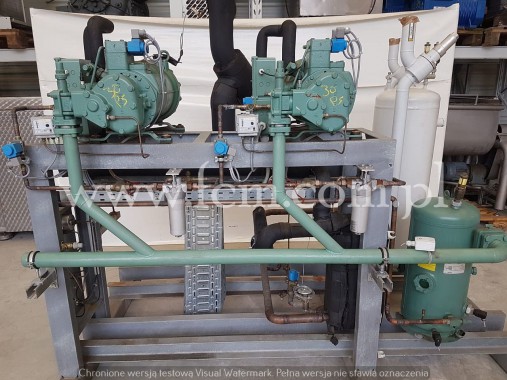 Zespół sprężarkowy BOCK - Typ: HGX4/650-4 (x2) - Przepływ: 56.6 m3/h (x2) - Wydajność chłodnicza zestawu: 76 kW przy -5°C/40°C, 62 kW przy -10°C/40°C, 32 kW przy -25°C/40°C - Czynnik chłodniczy: R404A - Wymiary urządzenia: 2650 x 950 x 1800 mm - Stan magazynowy: 1 zespół