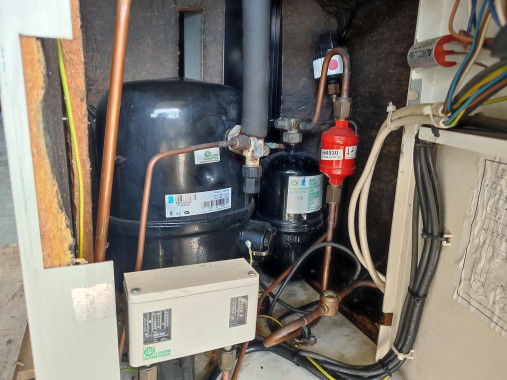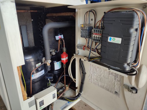 Używany agregat chłodniczy firmy L'unite w wygłuszającej obudowie typu silencys w dobrym stanie technicznym.