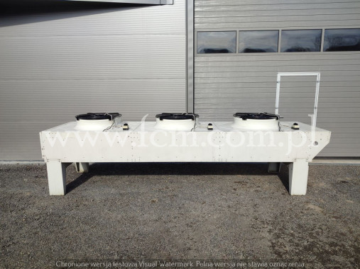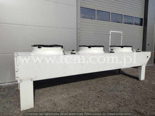 Skraplacz Guntner - Typ: GVH 067B/2x3-N(D) - Wydajność chłodnicza: 291/244 kW - Przepływ powietrza: 85650/65420 m3/h - Ilość wentylatorów: 6 x 650 mm - obr/min: 1340/1000 - Wymiary urządzenia: 3600 x 2300 x 1200 mm - Pojemność: 45.9 + 45.9 L - Waga: 640 kg - Stan magazynowy: 1 sztuka