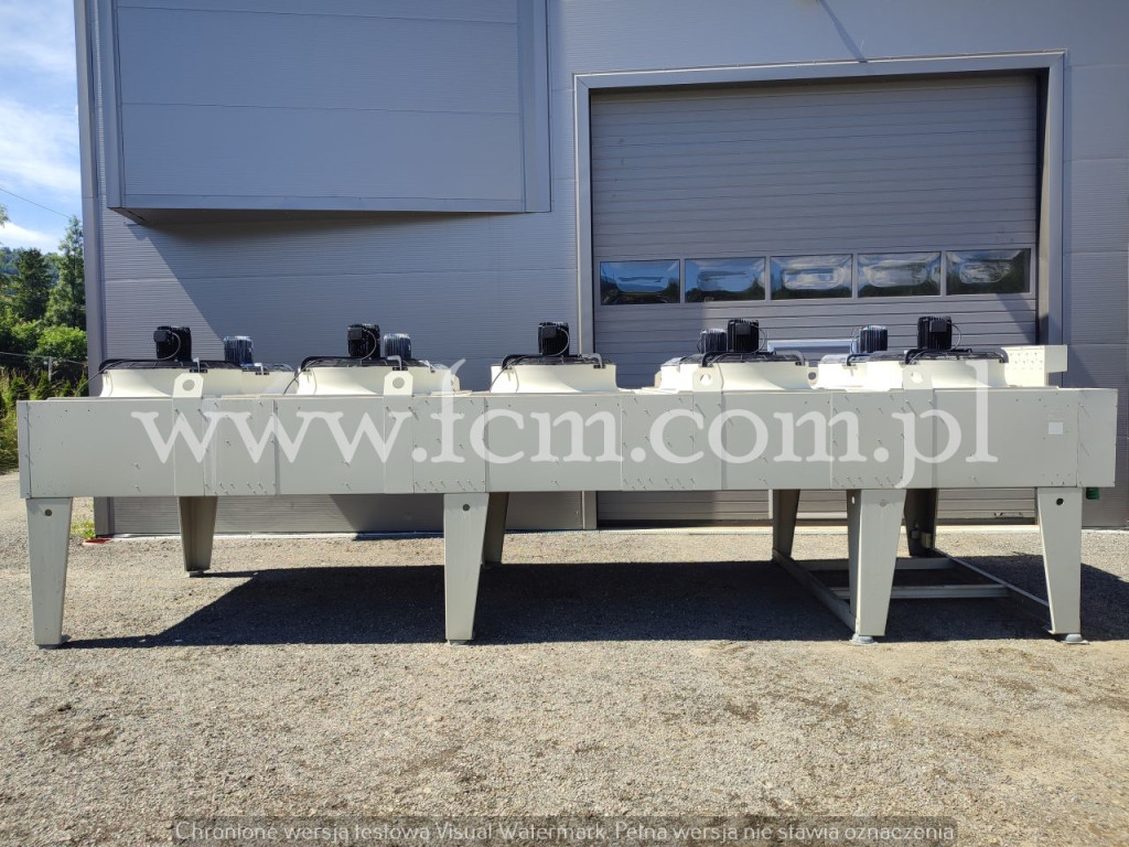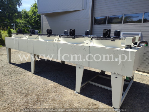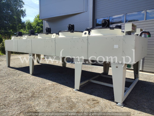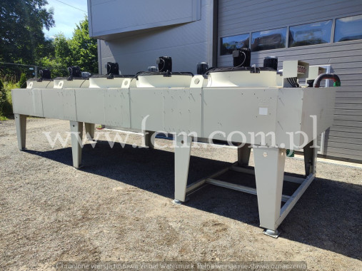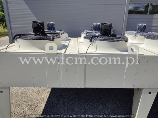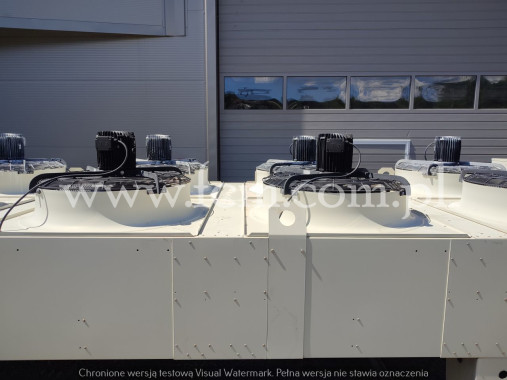 Skraplacz Guntner - Typ: GVH 067B/2x3-N(D) - Wydajność chłodnicza: 291/244 kW - Przepływ powietrza: 85650/65420 m3/h - Ilość wentylatorów: 6 x 650 mm - obr/min: 1340/1000 - Wymiary urządzenia: 3600 x 2300 x 1200 mm - Pojemność: 45.9 + 45.9 L - Waga: 640 kg - Stan magazynowy: 1 sztuka