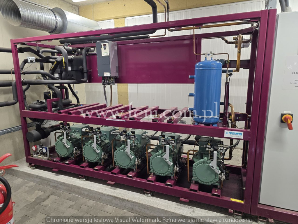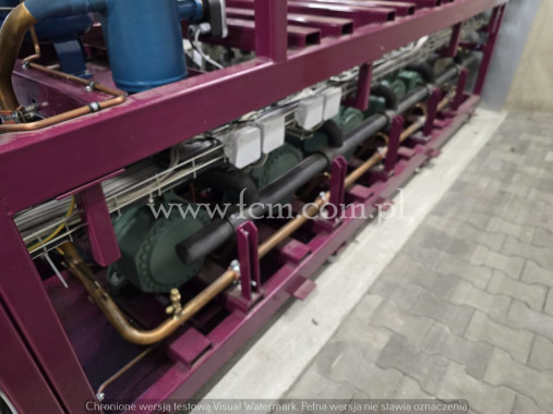 Zespół sprężarkowy Bitzer - Typ: 4DC-5.2Y-40S (x3) - Przepływ: 26.9 m3/h (x3) - Wydajność chłodnicza zestawu: 55.5 kW przy -5°C/40°C, 45 kW przy -10°C/40°C, 23.4 kW przy -25°C/40°C, 18 kW przy -30°C/40°C - Czynnik chłodniczy: R404A - Stan magazynowy: 1 zespół
