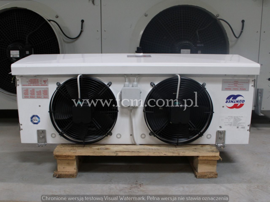 Chłodnica Guntner - Typ: GASC RX 031.1/3-70.A-1821039 - Wydajność chłodnicza: 7.7 kW przy DT8, 6.4 kW przy DT7 - Powierzchnia wymiany: 25 m2 - Przepływ powietrza: 6 400 m3/h - Lamel: 7 mm - Grzałki elektryczne - Ilość wentylatorów: 3 x 300 mm - Wymiary urządzenia: 2320 x 550 x 350 mm - Czynnik chłodniczy: CO2 - Pojemność: 5.7 L - Waga: 62 kg - Stan magazynowy: 1 sztuka