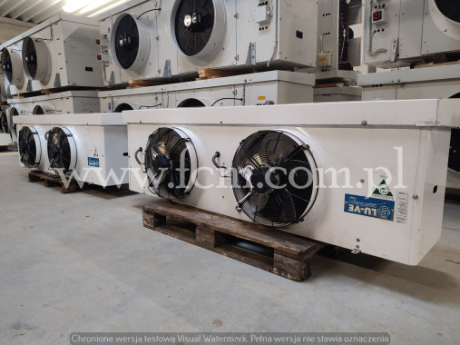 Skraplacz LUVE - Typ: EAV 9N 6222 - Wydajność chłodnicza: 312/388 kW - Przepływ powietrza: 64 000/88000 m3/h - Ilość wentylatorów: 4 x 900 mm - obr/min: 685/890 - Wymiary urządzenia: 4780 x 2400 x 1800 mm - Stan magazynowy: 1 sztuka