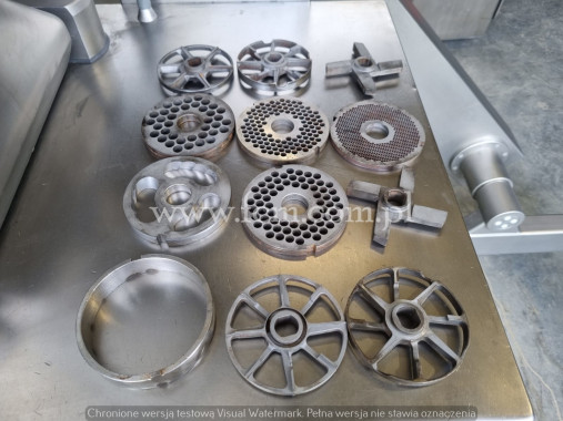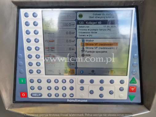 Nadziewarka próżniowa Handtmann - Typ: VF 50 - Wydajność: do 2600 kg/h - Pojemność kosza: 50 litrów - Ciśnienie nadziewania: do 55 bar - Prędkość porcjowania do 420 porcji/min przy tolerancji 10% - Zakres porcjowania: 5-100.000 gr. - Moc: 4 kW - Zasilanie elektryczne: 400V 50HZ 3N - Przykładowa tabela wydajności maszyny dla porcjowania i okręcania: - 25g - 420 por./min - 50g - 350 por./min - 100g - 250 por./min - 200g - 160 por./min - Waga netto: 660 kg - Wymiary zewnętrzne: 580 x 950 x 1600 mm - Wykonany ze stali nierdzewnej - Komplet lejków - Stan magazynowy: 1 sztuka - Stan: Używany - Okręcarka w dodatkowym wyposażeniu (płatna)