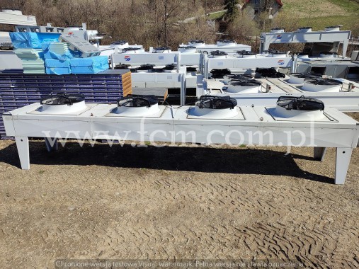 Skraplacz Guntner - Typ: GVH 067B/2x3-N(D) - Wydajność chłodnicza: 291/244 kW - Przepływ powietrza: 85650/65420 m3/h - Ilość wentylatorów: 6 x 650 mm - obr/min: 1340/1000 - Wymiary urządzenia: 3600 x 2300 x 1200 mm - Pojemność: 45.9 + 45.9 L - Waga: 640 kg - Stan magazynowy: 1 sztuka