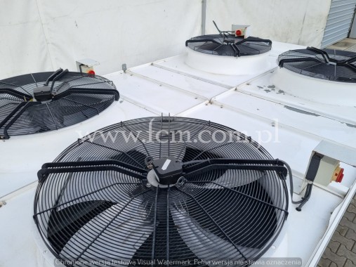 Skraplacz LUVE - Typ: EAV 9N 6222 - Wydajność chłodnicza: 312/388 kW - Przepływ powietrza: 64 000/88000 m3/h - Ilość wentylatorów: 4 x 900 mm - obr/min: 685/890 - Wymiary urządzenia: 4780 x 2400 x 1800 mm - Stan magazynowy: 1 sztuka