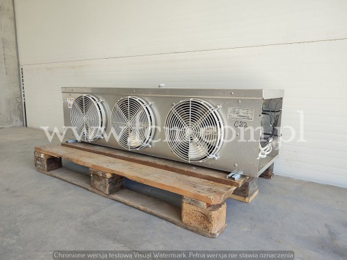 Chłodnica Guntner - Typ: GDF 030.1B/27-E - Wydajność chłodnicza: 2.83 kW przy DT8 - Lamel: 7 mm - Grzałki elektryczne - Ilość wentylatorów: 2 x 300 mm - 900/1250 obr/min - Wymiary urządzenia: 1640 x 500 x 250 mm - Czynnik chłodniczy: Freon - Pojemność: 4.1 L - Rok produkcji: 2012 - Stan magazynowy: 1 sztuka