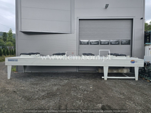 Skraplacz Guntner - Typ: GVH 067B/2x3-N(D) - Wydajność chłodnicza: 291/244 kW - Przepływ powietrza: 85650/65420 m3/h - Ilość wentylatorów: 6 x 650 mm - obr/min: 1340/1000 - Wymiary urządzenia: 3600 x 2300 x 1200 mm - Pojemność: 45.9 + 45.9 L - Waga: 640 kg - Stan magazynowy: 1 sztuka