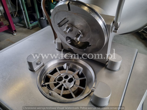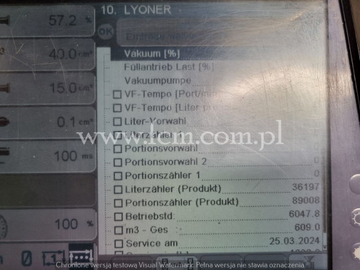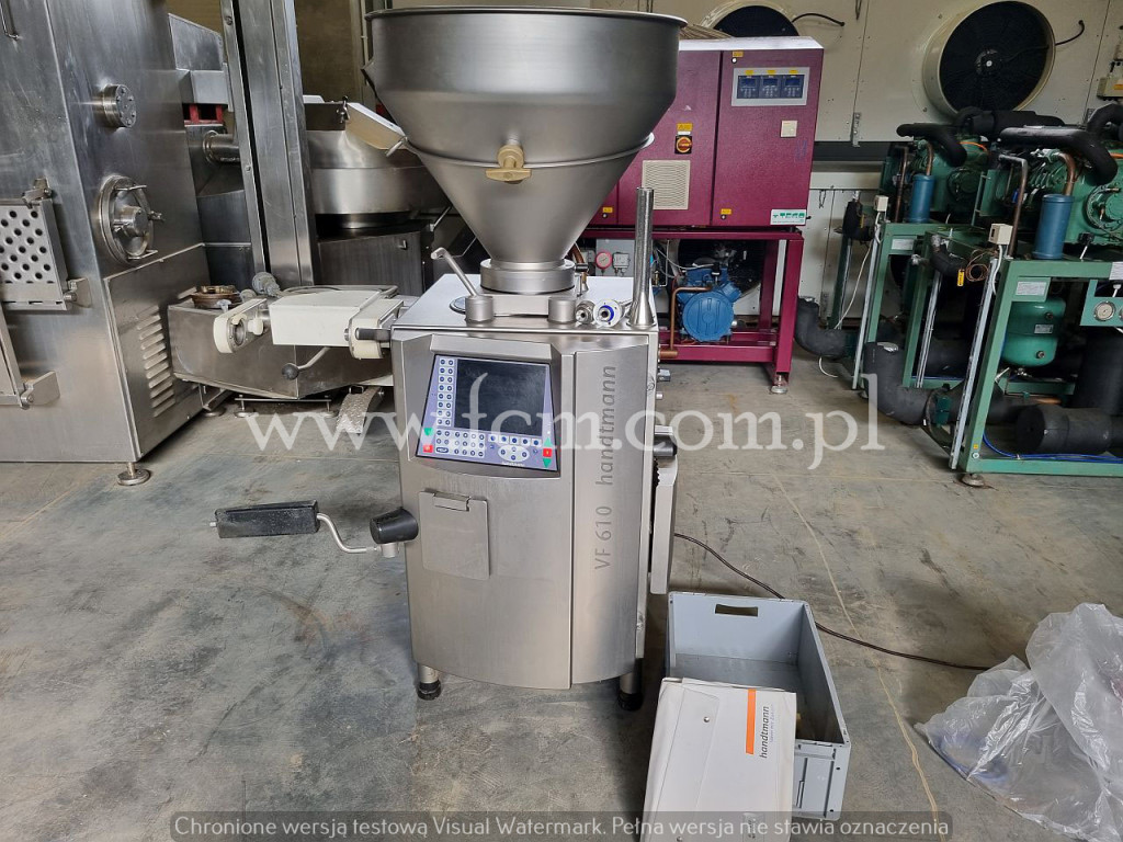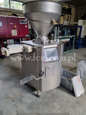 Nadziewarka próżniowa Handtmann - Typ: VF 50 - Wydajność: do 2600 kg/h - Pojemność kosza: 50 litrów - Ciśnienie nadziewania: do 55 bar - Prędkość porcjowania do 420 porcji/min przy tolerancji 10% - Zakres porcjowania: 5-100.000 gr. - Moc: 4 kW - Zasilanie elektryczne: 400V 50HZ 3N - Przykładowa tabela wydajności maszyny dla porcjowania i okręcania: - 25g - 420 por./min - 50g - 350 por./min - 100g - 250 por./min - 200g - 160 por./min - Waga netto: 660 kg - Wymiary zewnętrzne: 580 x 950 x 1600 mm - Wykonany ze stali nierdzewnej - Komplet lejków - Stan magazynowy: 1 sztuka - Stan: Używany - Okręcarka w dodatkowym wyposażeniu (płatna)