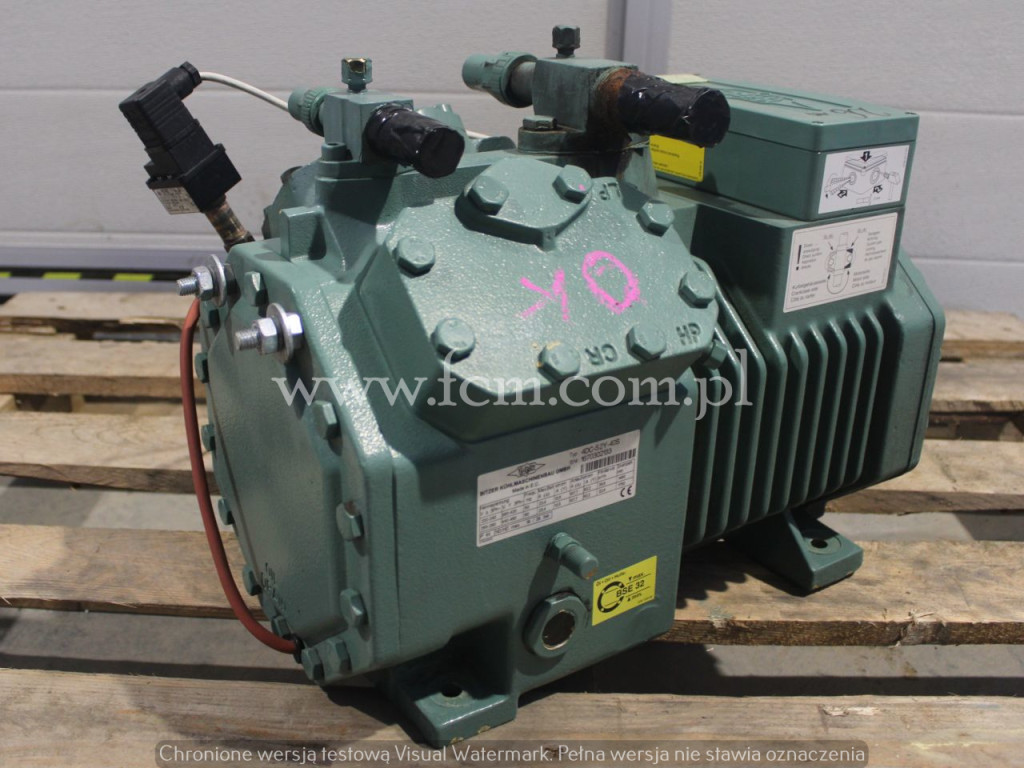 Sprężarka chłodnicza Bitzer - Typ: 4T-8.2Y-40P - Przepływ: 39.4 m3/h - Wydajność chłodnicza: 22.3 kW przy -10°C/40°C, 11.4 kW przy -25°C/40°C, 4.7 kW przy -40°C/40°C - Czynnik chłodniczy: R404A - Stan magazynowy: 2 sztuka - Numer magazynowy: S108 - Stan: Używane/urządzenia w pełni sprawne