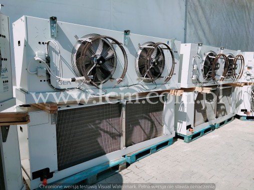 Chłodnica Guntner - Typ: GDF 030.1B/27-E - Wydajność chłodnicza: 2.83 kW przy DT8 - Lamel: 7 mm - Grzałki elektryczne - Ilość wentylatorów: 2 x 300 mm - 900/1250 obr/min - Wymiary urządzenia: 1640 x 500 x 250 mm - Czynnik chłodniczy: Freon - Pojemność: 4.1 L - Rok produkcji: 2012 - Stan magazynowy: 1 sztuka